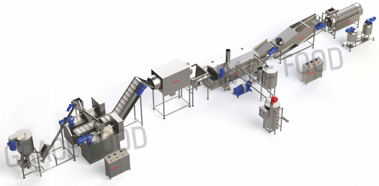 Extruded Fried Corn Snack Production is manufactured in India by Grace Food Processing & Packaging Machinery®. These snacks are also known by the name Snack Random Collets Production Lines and Cheetos Production line around the world. Process is to mix the corn meal and other ingredients in the Raw Material Corn Meal Mixer. After mixing corn meal is extruded at high temperature to produce stick shaped collets or Raw Kurkure stick. These random collections are passed through a continuous Snack Food Fryer.