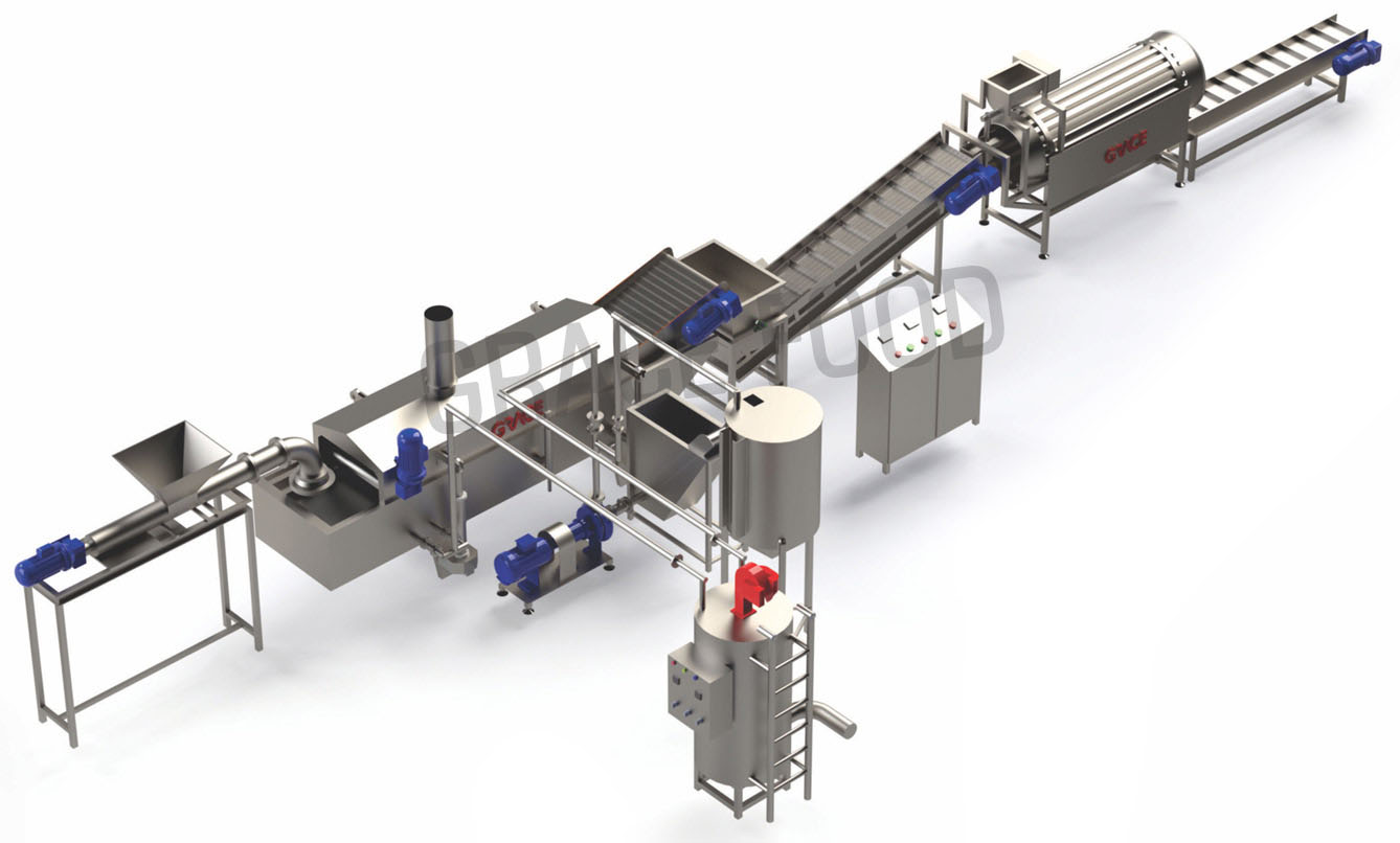 Snacks need a coating to become attractive, this is done in a coating drum immediately after drying. The coating drum comes in various sizes and has on the inside a self-cleaning profile. To ensure uniform residence time, strips are mounted in the drum. The rotation speed of drum are variable.