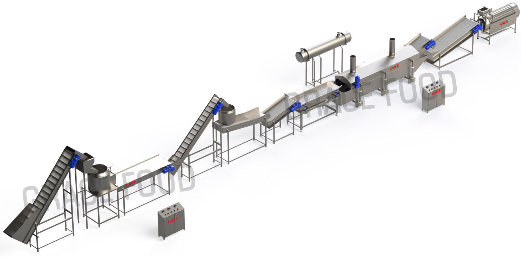 Grace Processing & Packaging®️ offers Potato chips production line to manufacture potato chips. Chips production plant, Potato processing machinery designed precisely to get high quality potato chips. Fresh From The Farm To Tasty Crispiness we have developed Complete Processing Lines For Potato Chips.